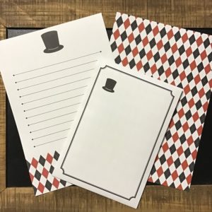 Shop, 作品 シルクハットのお手紙 2023-03-16 / シルクハットとアーガイル柄の組み合わせで私もかなり気に入っているレターセットです。郵便で送れる大きさの封筒なので、切手を貼る場所の目印としてシルクハットを配置しています。便箋の裏はご覧の通り全面アーガイル柄なのですが、実は封筒の中も同じ柄なんです。ショップでも販売中ですが、クリマにも持っていく予定です。