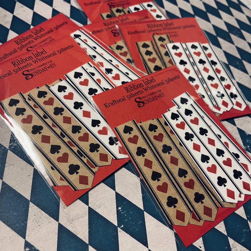 パッケージ, 作品 パッケージ 2026-03-24 / 【トランプリボンシール】 先日minneとcreemaにアップしたリボンシール。 赤の台紙は白シールとクラフトシールのどちらも映えるので気に入って使っています。 こうして何枚かをまとめるとリボンっぽい感じがより出ている気がする💭 さて、次のイベントは5月のクリエーターズマーケットとZINEフェス名古屋です。 できれば新作をたくさん持っていきたいので、積んである新作の印刷部を作業しては袋詰めして、その間に試作してという毎日です。