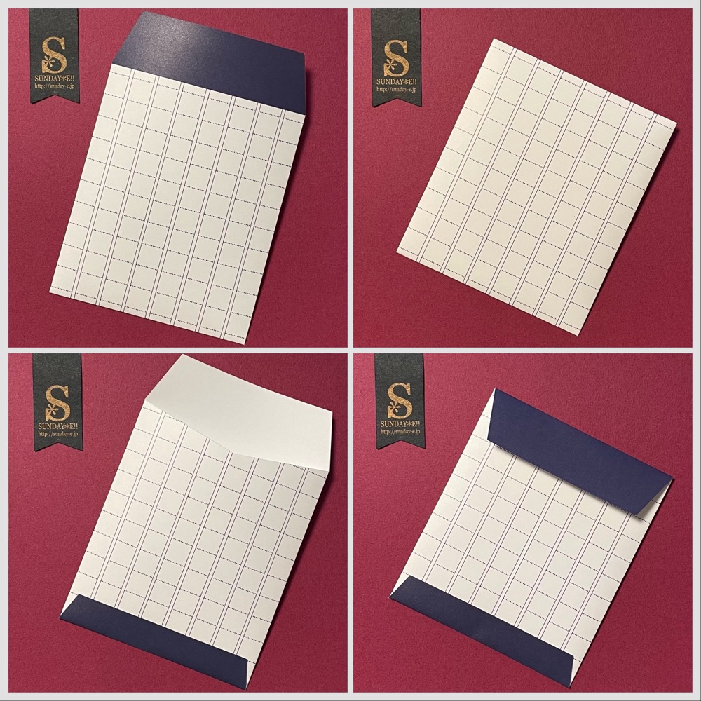 裏側の中心にのりしろを作っているのですがきちんと中心がvになっていることと、重なっている部分が原稿用紙の柄を崩すことのないデザインにすることを試行錯誤したのでこの仕上がりはかなり満足しています。