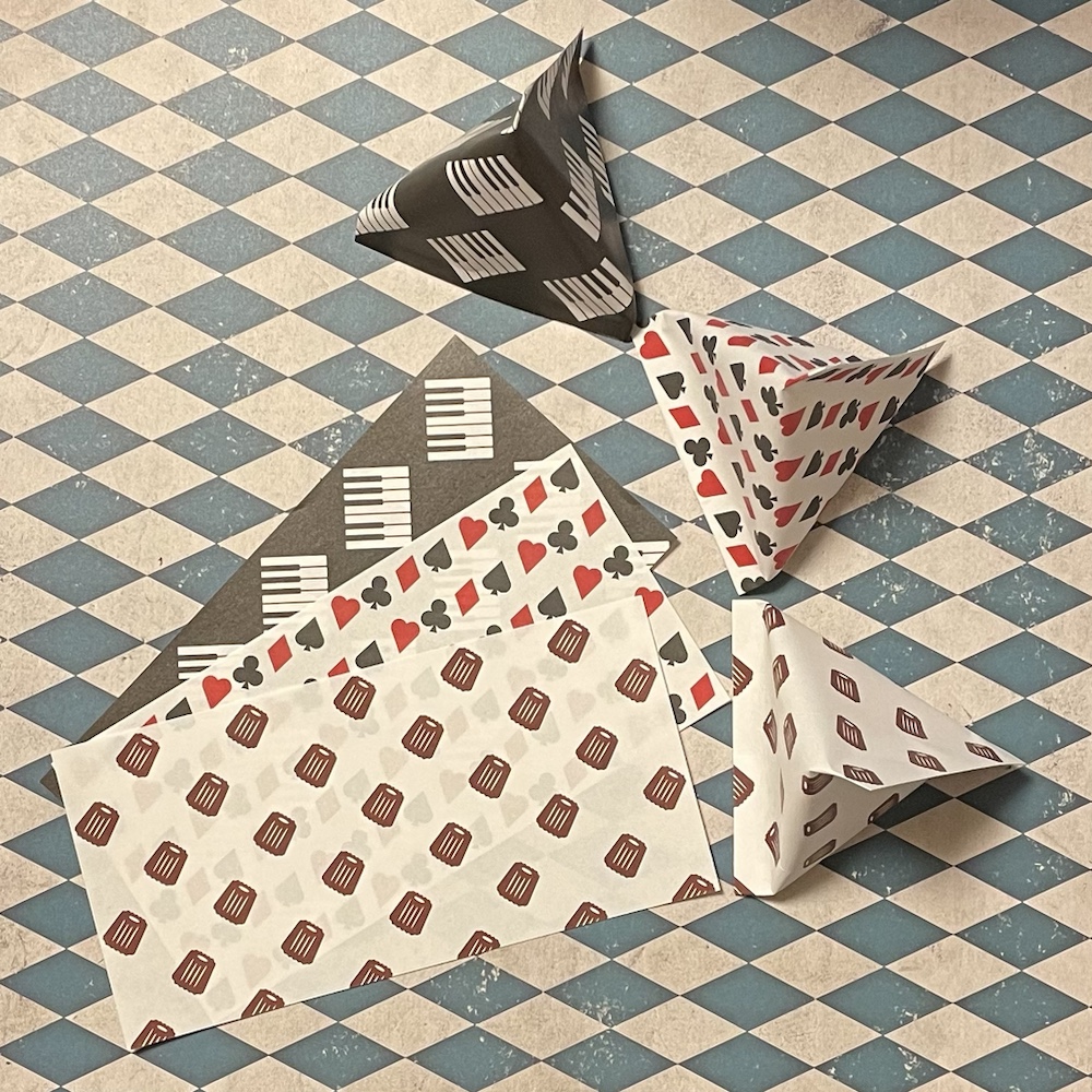 紙が好きで始めた紙の雑貨作り。小さい頃はまさか自分でデザインした紙が作れるなんて思いもしませんでした。私が作っているデザインペーパーは正方形でカットしていますので、折り紙としても使えます。現在カヌレ柄、トランプ柄、鍵盤柄があります。今回はその中からラッピングに使えそうな柄を選んでみました。