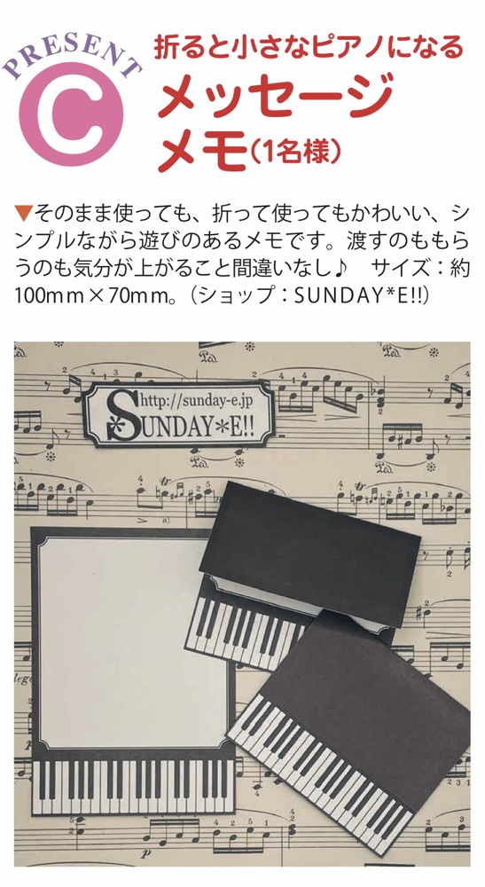 6月20日発売の月刊誌「月刊ピアノ」(ヤマハミュージックエンタテインメントホールディングス刊)の、読者プレゼントのコーナーにて、SUNDAY*E!!の【折ると小さなピアノになるメモ 】が掲載されています。